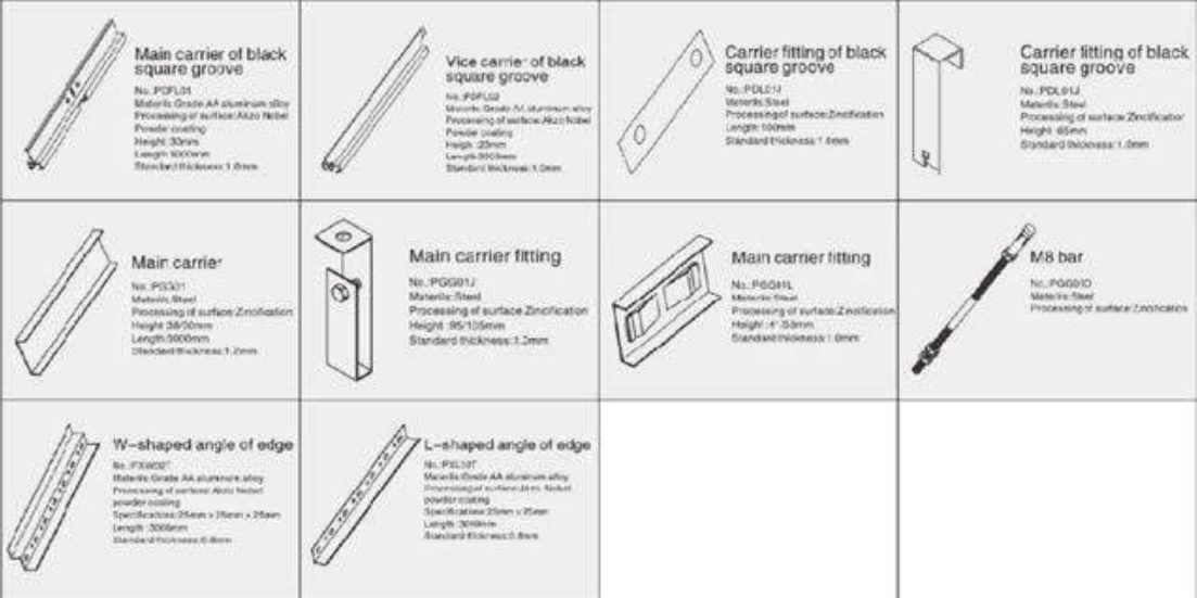 | Installation accessories | Light steel keel, 12mmplywood batten, special clip piece |
