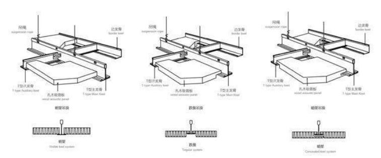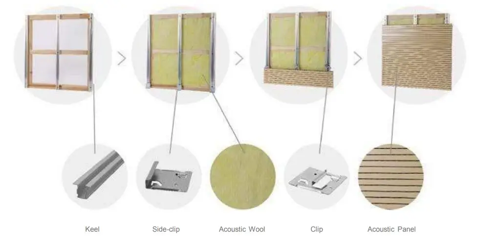 Install the wood keel or steel keel as per design drawing and construction draw. The configuration for the keel should be the same as the wood acoustic panel. The recommended distance is 300-600mm.